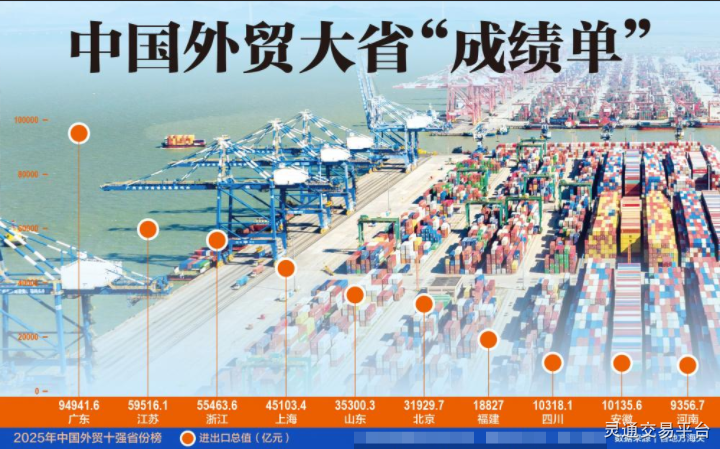 近日,31个省份2025年外贸数据陆续公布。2025年,全国进出口总值达45.47万亿元,增长3.8%,外贸总值突破万亿元的省份增至9个。
